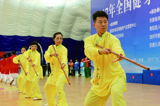 1115日,2017年全国健身气功站点联赛总决赛在池州九华山茶溪小镇开幕,共有来自北京、江苏、上海、福建、河北等32支代表队、200余名健身气功选手汇聚在有着“莲花佛国”美誉的九华山,通过以赛会友,共享健身气功运动健康与快乐。