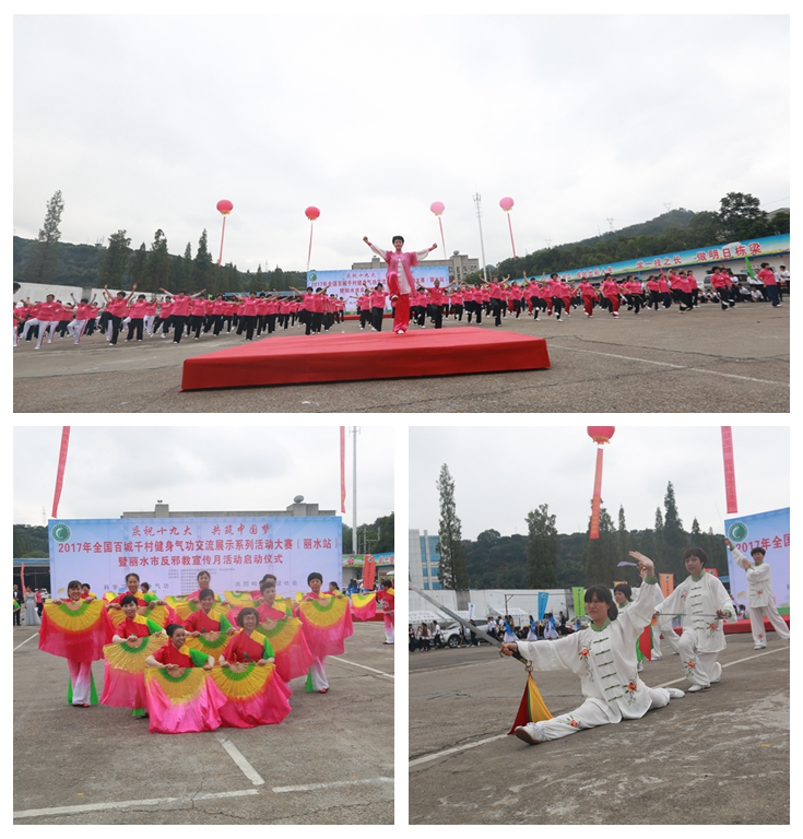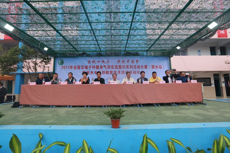 10月18日上午,由国家体育总局健身气功管理中心、浙江省体育局主办,丽水市体育局、丽水市委防范办承办,丽水市健身气功协会、丽水市技工学校、丽水仲裁委员会、丽水市老年体协、浙江丽水安邦护卫有限公司、丽水学院教职工健身气功协会协办的2017年全国百城千村健身气功交流展示系列活动大赛(丽水站)在丽水市技工学校举行。原丽水学院党委书记、丽水市老年体协主席肖建中,丽水市体育局副局长潘智慧,丽水市委防范办副主任胡太顺,丽水仲裁委员会秘书长施连成,丽水市技工学校校长梅三莲,丽水市健身气功协会会长李勇波等出席活动。会议由赵伟敏主持,梅三莲致辞,肖建中宣布大赛开始。